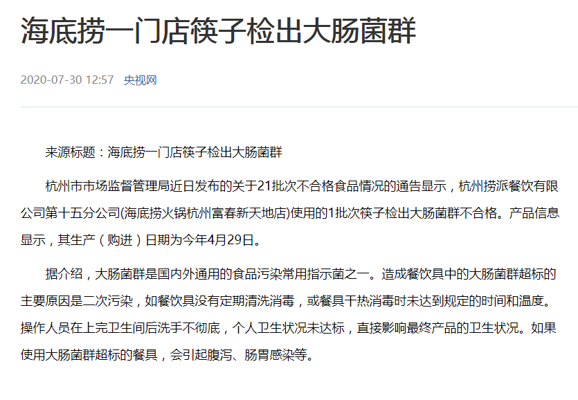 海底撈一門店筷子檢出大腸菌群,使用抗菌筷刻不容緩!时间:2020-07-31 阅读